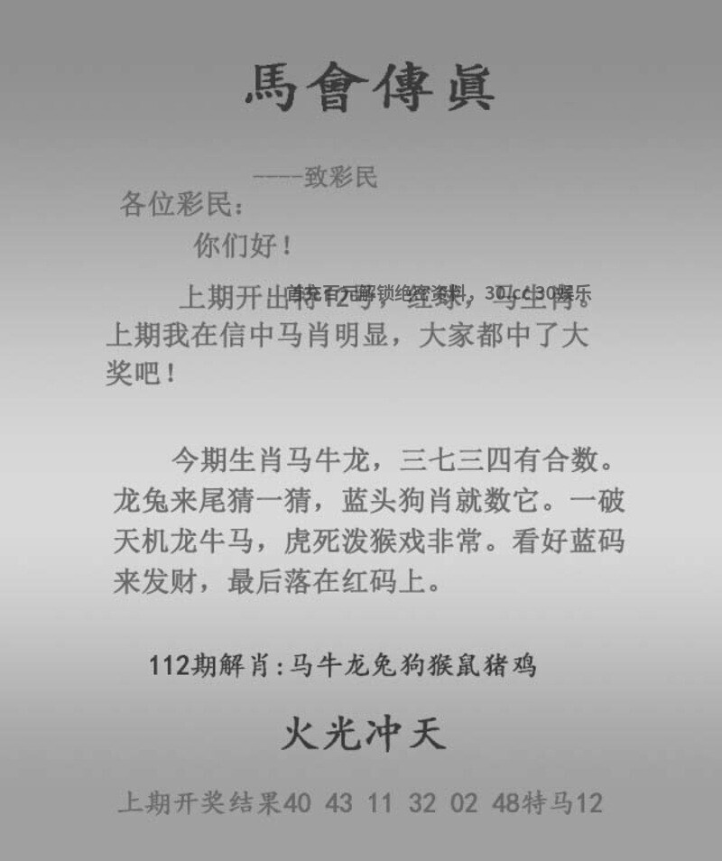 112期:【正版马会传真】{开:龙02} 今期生肖马牛龙,三七三四有合数 龙兔来尾猜一猜,蓝头狗肖就数它 一破天机龙牛马,虎死泼猴戏非常 看好蓝码来发财,最后落在红码上 火光冲天 综合取肖:马牛龙兔狗猴鼠猪鸡 ![]() |